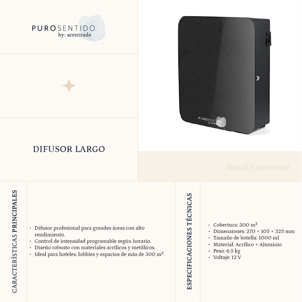 El Largo de Puro Sentido redefine la experiencia olfativa en espacios amplios con su tecnología avanzada de difusión por nebulización y su diseño contemporáneo en acrílico y aleación de aluminio. Elegante, potente y silencioso, está pensado para quienes buscan mantener un ambiente refinado y perfumado de forma constante y profesional.