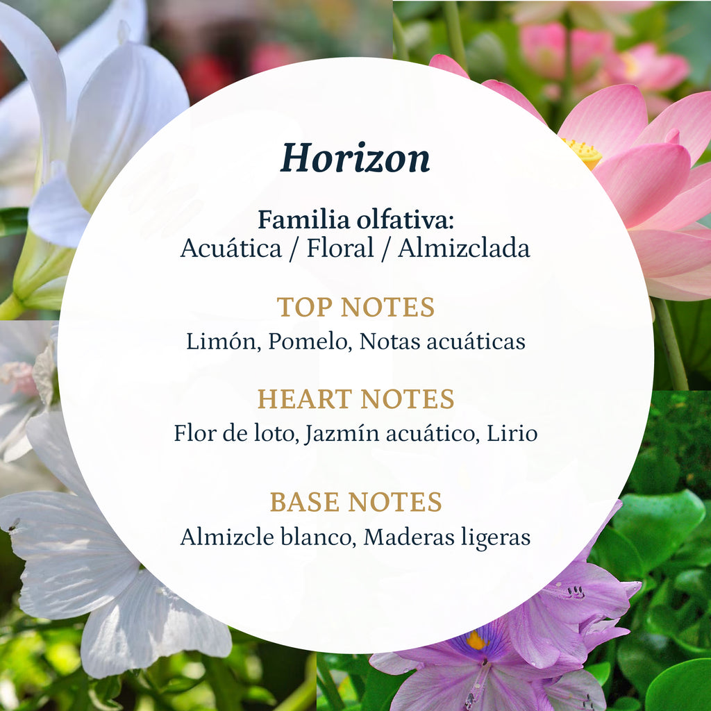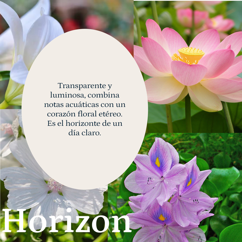 Clara y luminosa, combina notas acuáticas con un corazón floral etéreo de flor de loto y lirio. Su aroma evoca la sensación de un amanecer junto al mar, lleno de calma y equilibrio.