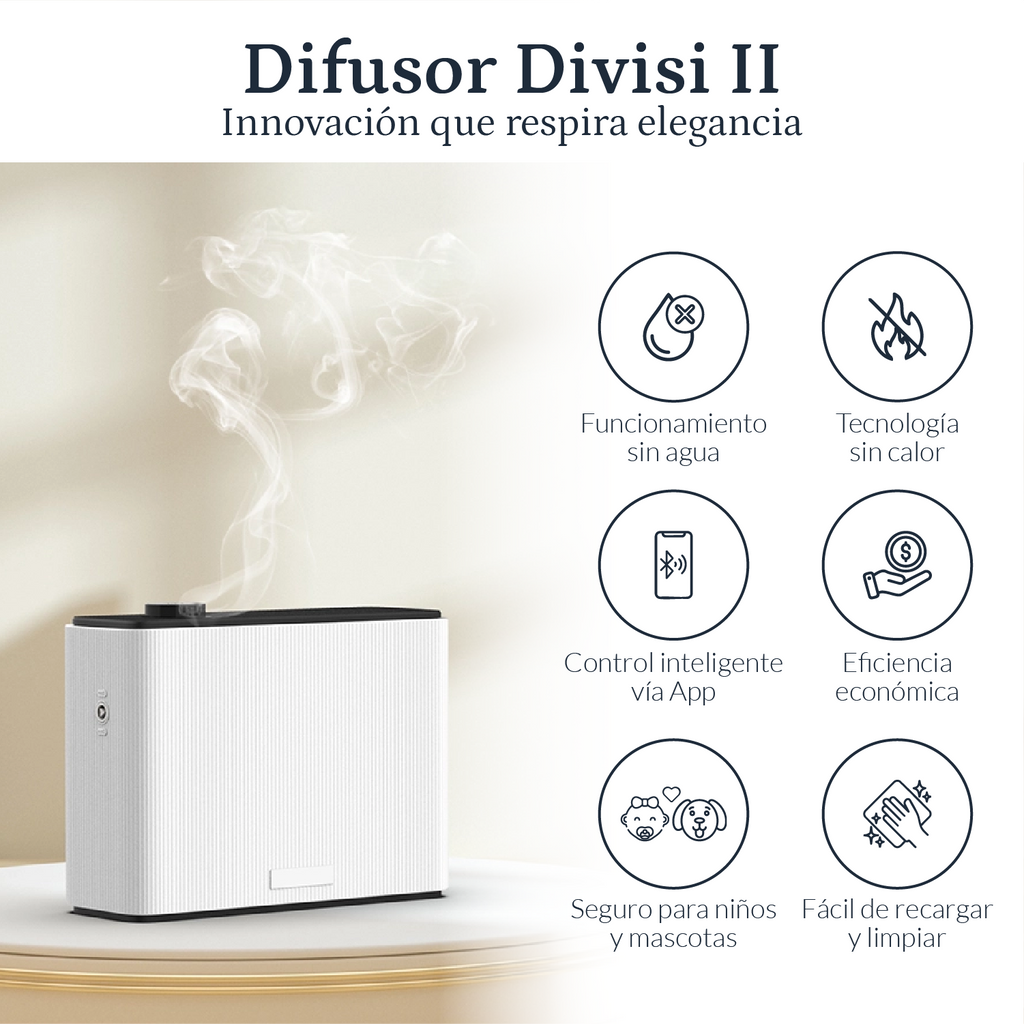 El Difusor Divisi de Puro Sentido combina elegancia y rendimiento en un formato compacto ideal para espacios medianos. Diseñado con materiales de alta calidad y tecnología de nebulización avanzada, ofrece una experiencia aromática envolvente, uniforme y silenciosa. Perfecto para hogares, boutiques, oficinas o salas de espera que buscan un toque de sofisticación y bienestar.