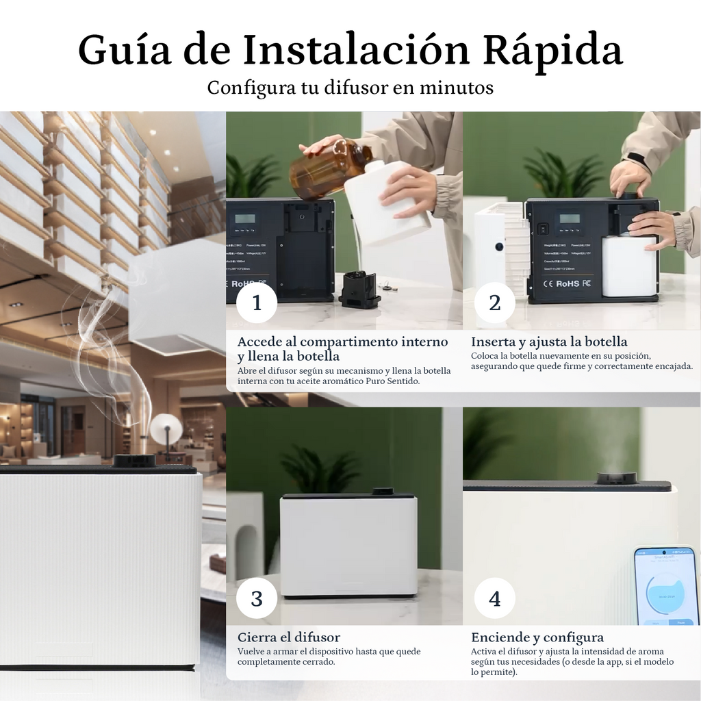 • Control Preciso: Sistema digital que permite ajustar la intensidad de aroma según el tamaño del espacio y la preferencia del usuario.